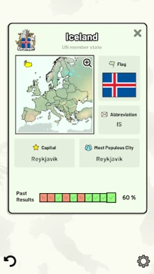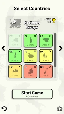 Customizable quizzes allow you to choose which European countries to test, as well as the topic. Past results for each country are displayed to highlight your progress at each topic.